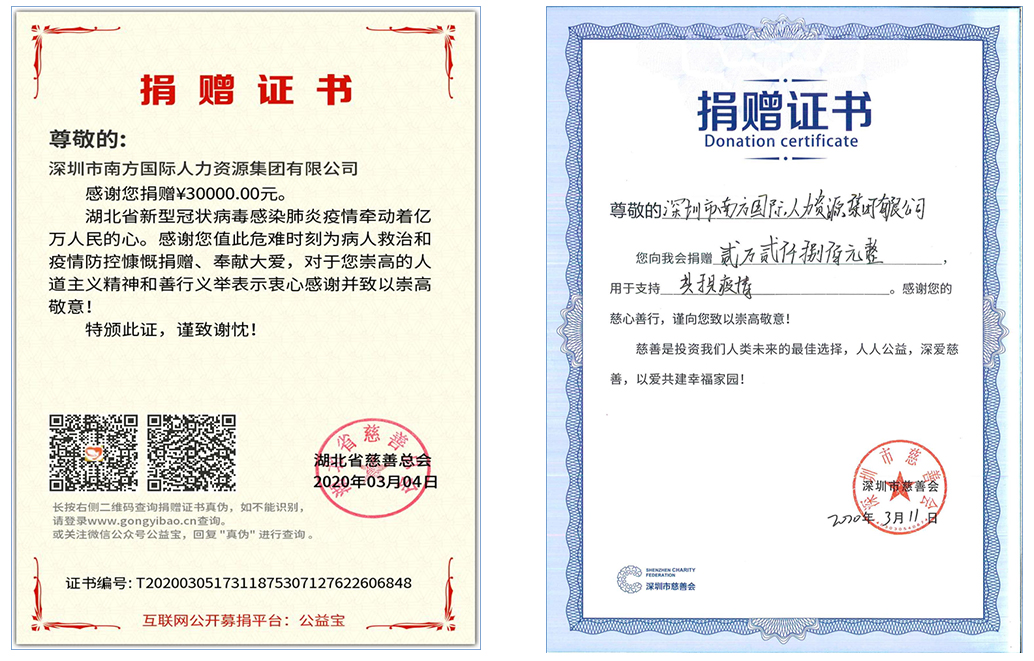 2020年2月18日,深圳市南方国际集团工会发起“我为防控新冠肺炎疫情捐款”倡议,短短2天时间,通过线上捐款方式,集团工会收到97名员工共计52800元的捐款,并分别上缴至湖北省慈善总会和深圳市慈善会。