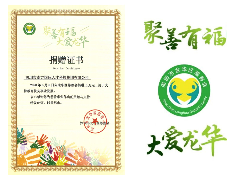 2020年6月8日,深圳市南方国际集团向龙华区慈善会捐款3万元,用于支持教育扶贫事业发展。